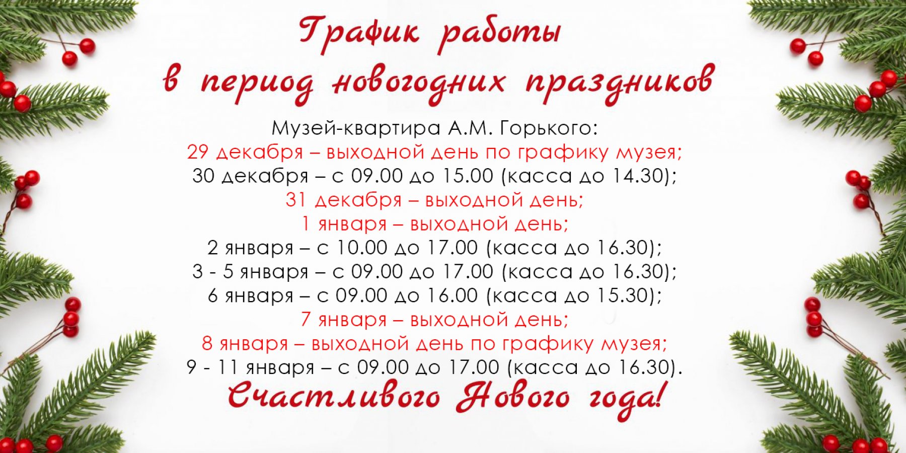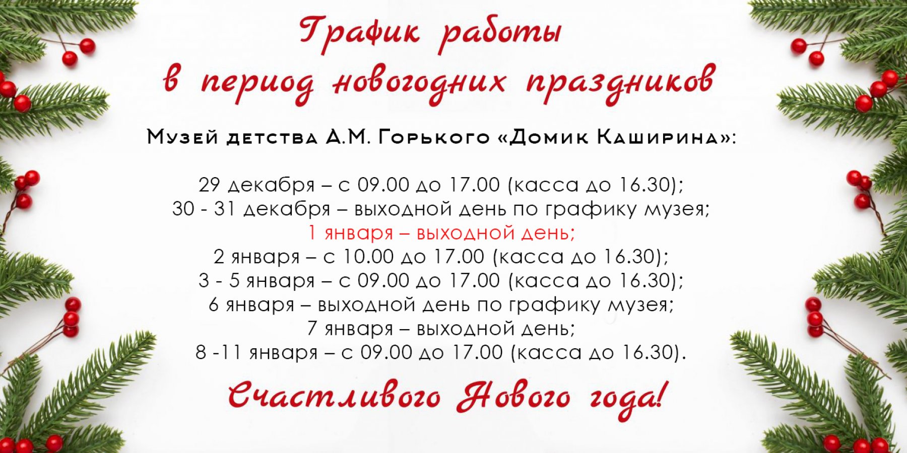 08-11.01.2026г. – с 09.00 до 17.00 (касса до 16.30).